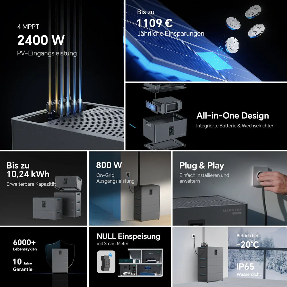 ★★★★★ Marstek — 4.8/5 Herstellerbewertung · CES 2026 🔋 2.560 Wh Kapazität — LiFePO₄, 6.000+ Zyklen ⚡ All-in-One + Mikro-Wechselrichter — 800W Ausgang 🔌 Plug & Play — Panels anschließen, Stecker rein, fertig 🖥️ Touch-Display + App — Steuerung auch ohne Smartphone 🔗 Erweiterbar — bis 4 Einheiten stapelbar (10,24 kWh) ✓ 0% MwSt. — Solarprodukte sind in Deutschland mehrwertsteuerfrei